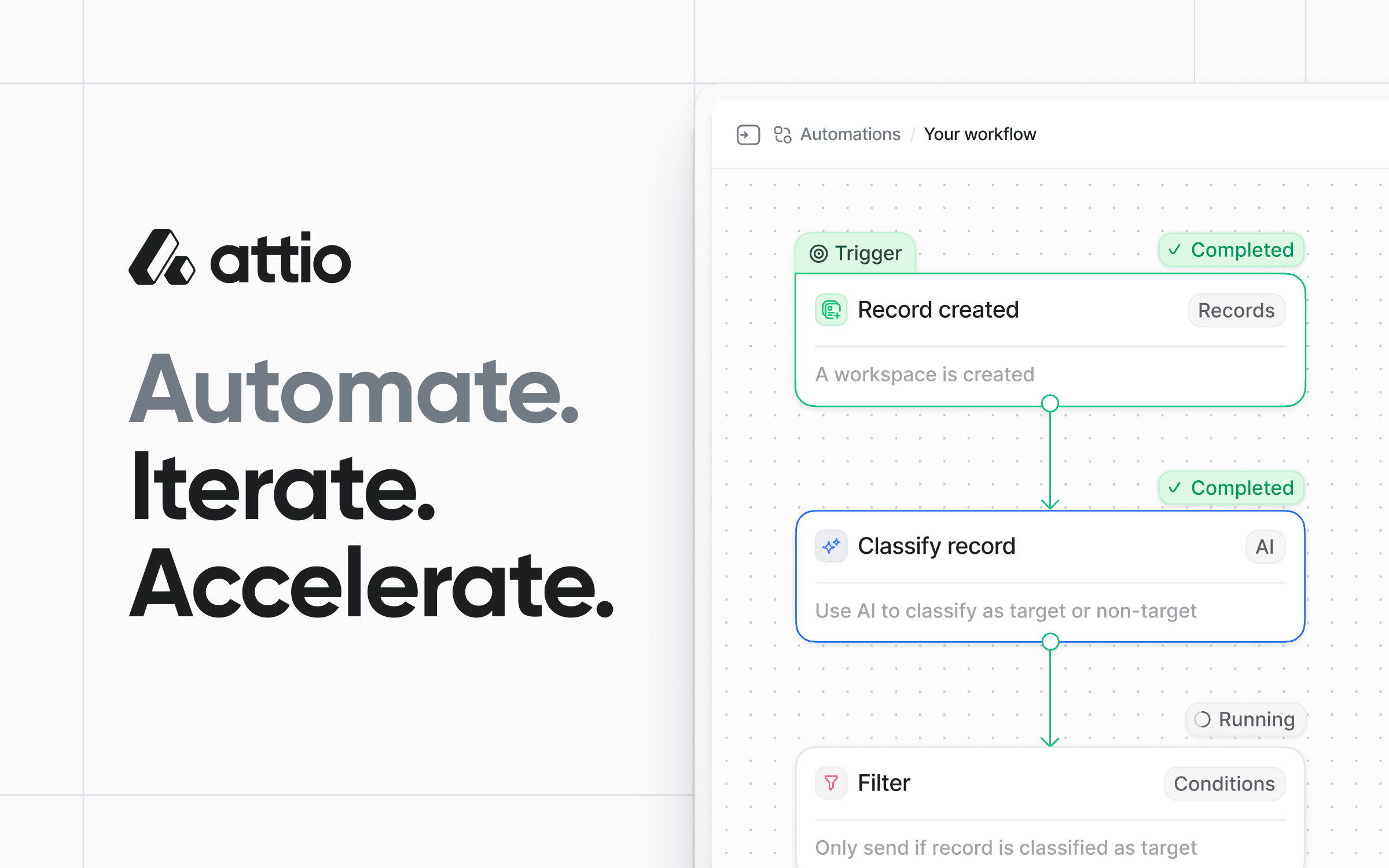 Attio Automations is the feature that allows you to build and automate nearly any process right inside of Attio. It's designed to give your team complete control and flexibility to automate repetitive tasks, create lead scoring systems, or implement comprehensive data integration systems. With Attio Automations, you can build systems that automatically route leads based on their potential or auto-identify customers based on their subscription and product usage data.